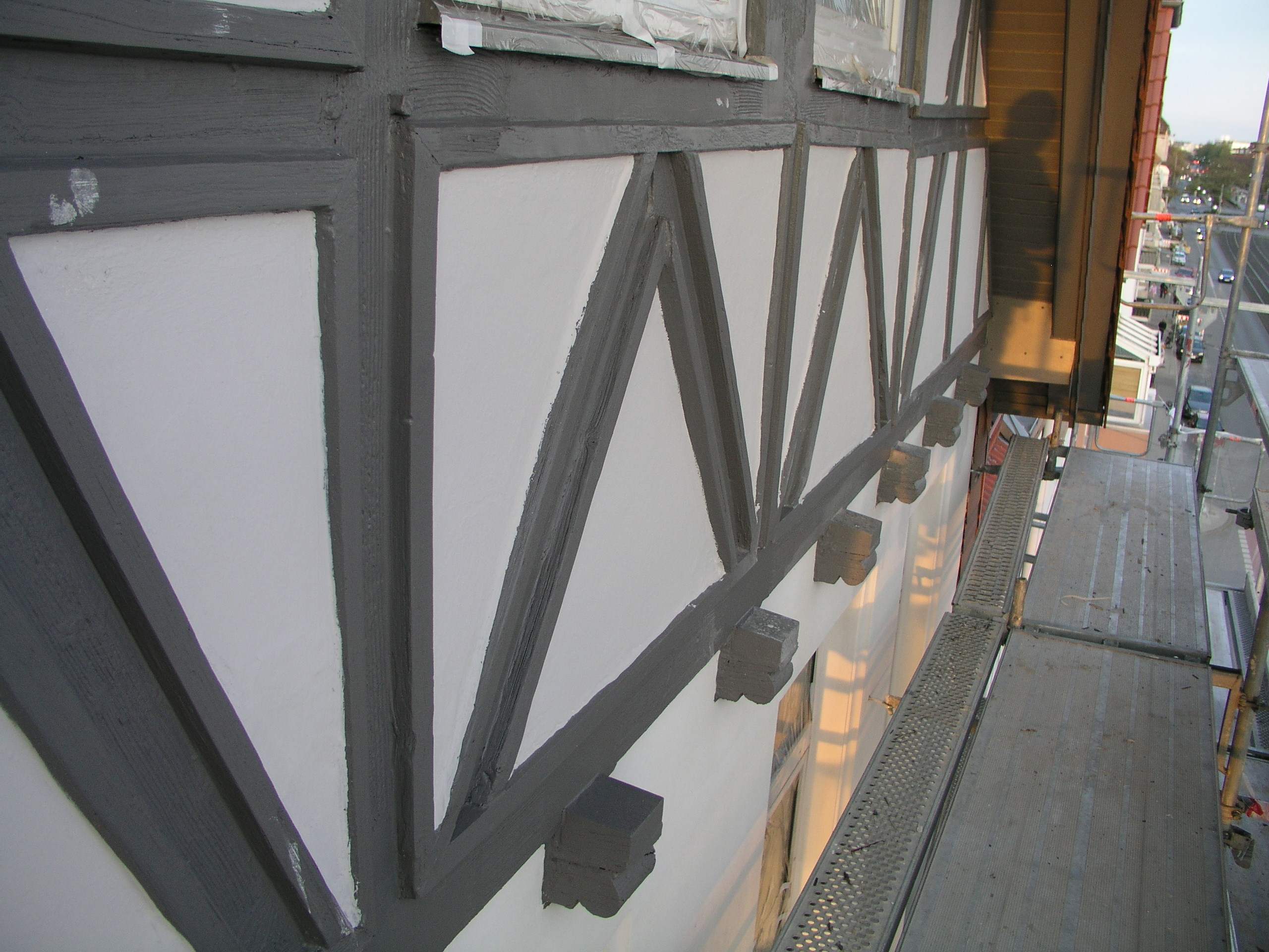 Die größeren Risse in den vorstehenden Pfetten wurden ausgespant und mit von unten eingesetzten Vollgewindeschrauben konstruktiv ertüchtigt. Die Verleistung wurde entfernt und durch Holzleisten; nach Möglichkeit aus Laubholz, mit oberer Abschrägung befestigt und mit dünnen Nägeln oder Klammern ersetzt. Die neue Verleistung fasst nur die einzelnen Gefache ein. Dies setzt einen tragfähigen Untergrund voraus. Die Gefache oberhalb der Fenster bedurften nur einer malermäßigen Sanierung. Die vorhandenen Spachtelmassen wurden entfernt und ggf. durch gleichwertige Holzquerschnitte ersetzt.