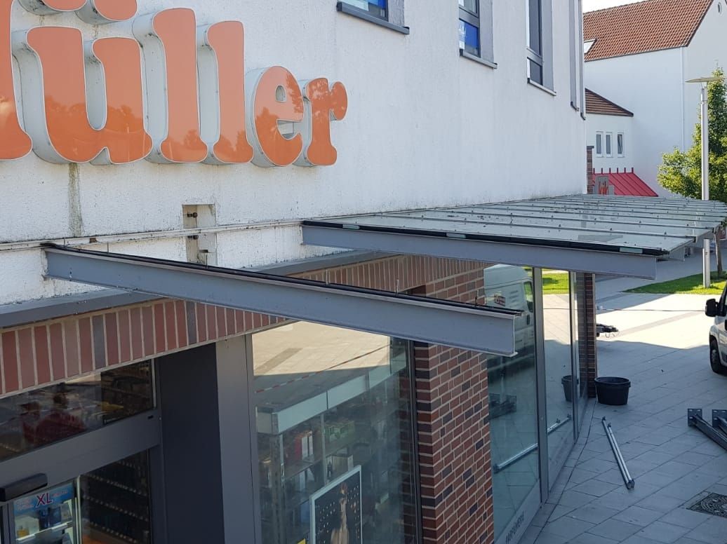An dem Objekt Breslauers Str. in Espelkamp befindet sich ein Drogeriemarkt. Die Fassade an der Breslauer Str. ist in gebogener Form ausgeführt. Über die gesamte Fassadenlänge ist ein Glasvordach angeordnet. Das Glasvordach ist in einer Segmentbauweise ausgeführt und ist auf Stahlträgerkonsolen aufgelagert. Drei Stahlträgerkonsolen des Glasvordachs sind verformt und 5 VSG-Glasscheiben passen nicht zu den Bestandscheiben der gebogenen Fassade. Ziel war es die verformten Stahlträger zu erneuern sowie das Glasdach optisch und in der technischen Ausführung dem Bestand anzupassen.